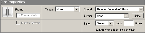 9. Open your properties inspector. Set the sound property to the thunder-supershe wav. and set the sync to stream. Click the edit button.